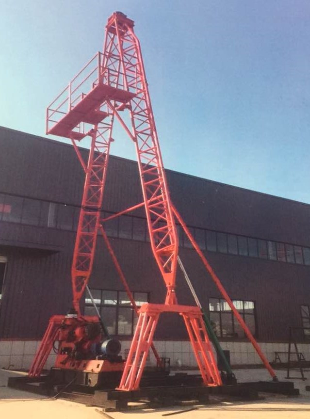 AY-13型鉆塔可配套各種水井鉆機(jī)和XY系列巖心鉆機(jī)垂直、斜孔的施工。其特點(diǎn)為設(shè)計(jì)除具有承載能力較大、結(jié)構(gòu)合理、液壓起塔安全可靠,拆裝、搬運(yùn)成本低等特點(diǎn)外,最顯著特點(diǎn)一是塔腳跨度大(5米),操作鉆機(jī)空間大;二是塔身下塔腿連接鉸鏈高于底座底梁2.3米,從而在鉆機(jī)左右擺放時(shí)下塔腿不影響鉆機(jī)前后移車,鉆機(jī)動(dòng)力部分可移至腿支撐內(nèi)襠中。也使得斜孔鉆進(jìn)和提鉆過程中天車、回轉(zhuǎn)、井孔達(dá)到三點(diǎn)一線,大大提高了定向井孔施工的精準(zhǔn)度及安全。